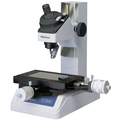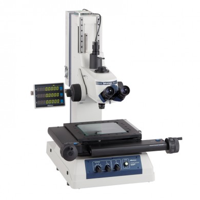 A Mitutoyo toolmaker's microscope well suited for measuring linear dimensions and angles of features on small workpieces with the XY stage and rotating eyepiece scale. Micrometer heads are optional to enable a choice of digital or non-digital types to be fitted. The microscope can also be used to check the form of screw threads and gears by attaching an optional reticle from the wide range available. The compact body makes it ideal for use on shop floors with limited space for measuring instruments. Standard magnification is 30X, which can be increased up to 200X with optional objectives and eyepieces or reduced to 20X by interchanging the eyepiece.