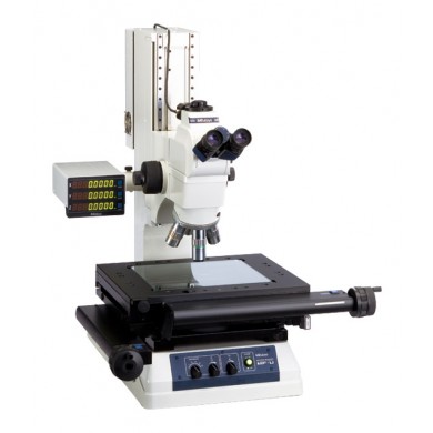 A high power, multifunctional Mitutoyo measuring microscope offering monocular or observation with a clear, non-flare image and a wide field of view. Measuring accuracy is the highest in its class. The ML series, high-NA objectives provide a long working distance and the illumination source, reflected or transmitted, is selectable between high-intensity LED or halogen, with a variable aperture diaphragm to suppress diffraction. A quick-release mechanism allows the stage to be moved around quickly and coarse/fine feed handles on both sides allow precise focus and observation regardless of handedness. Optional eyepieces enable observation up to 2000X magnification.