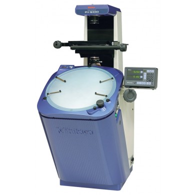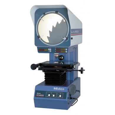 A bench top Mitutoyo profile projector based on a vertical beam, telecentric optical system for distortion-free viewing on a 315mm diameter protractor screen. The measuring stage incorporates linear scales for fast and accurate linear measurement to 1µm/.0001”, with angle measurements on screen to a resolution of 1’/0.01° of arc. Built-in digital readout of XY position and angle (including zero-setting, ABS/INC mode measurement) is located near the projection screen to minimize eye movement.